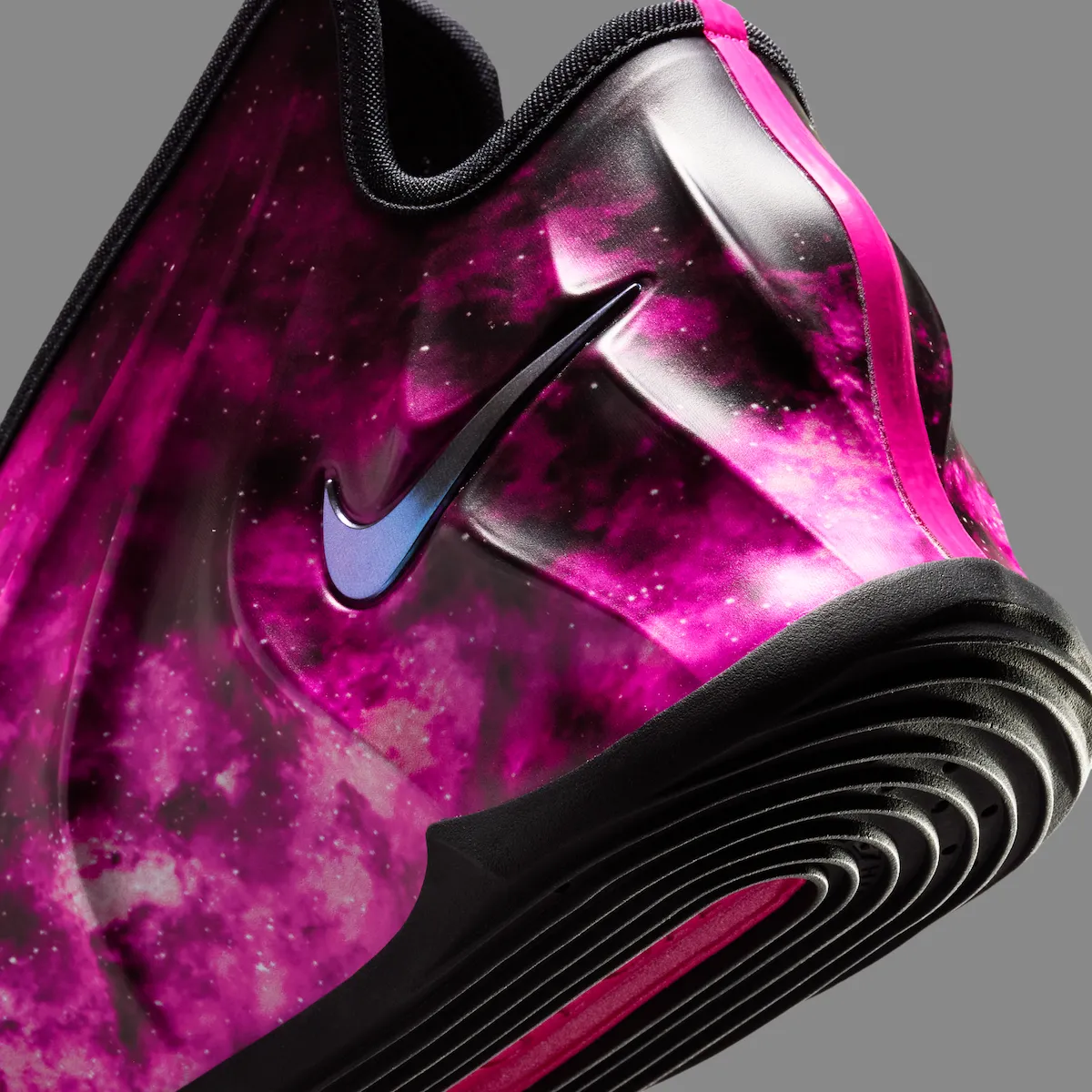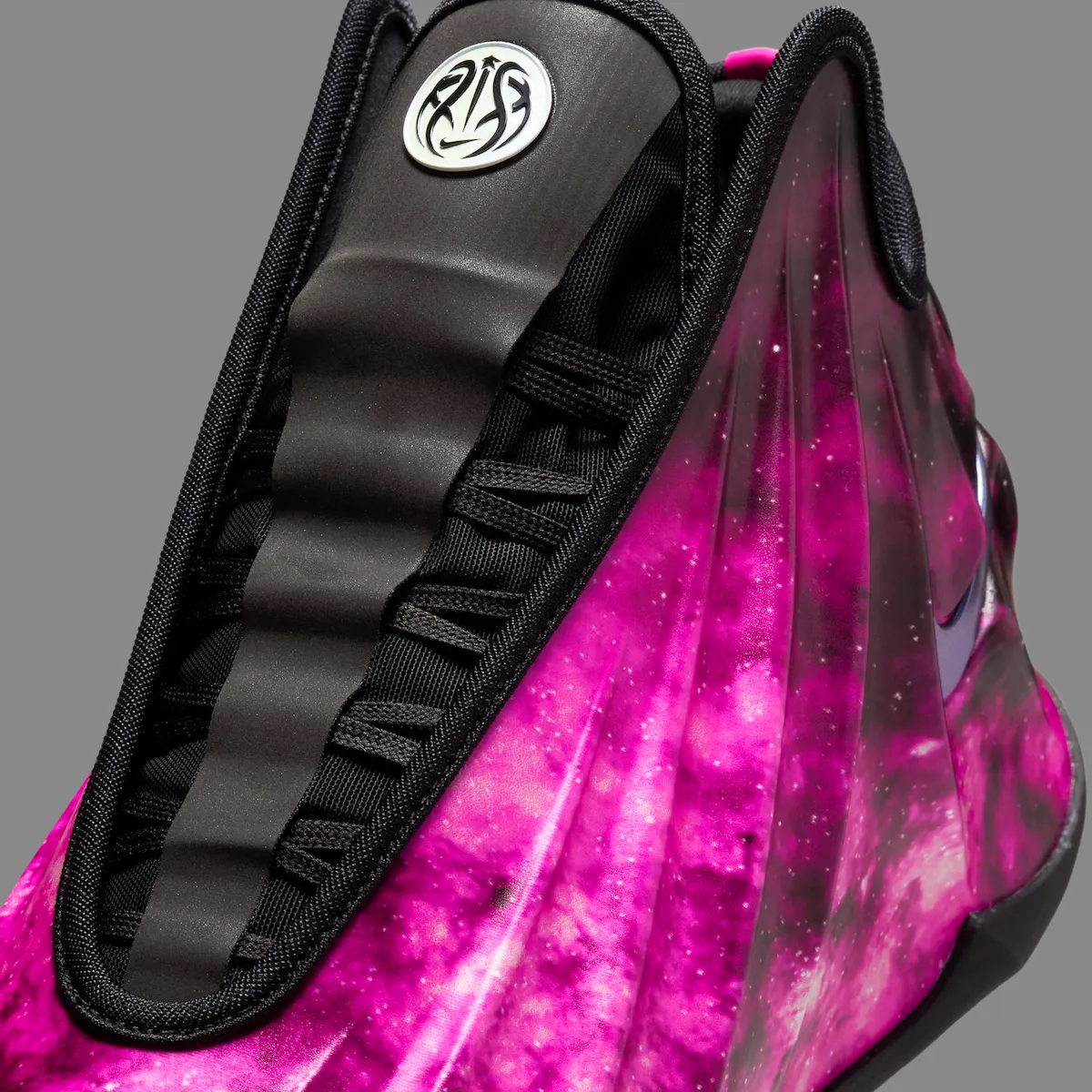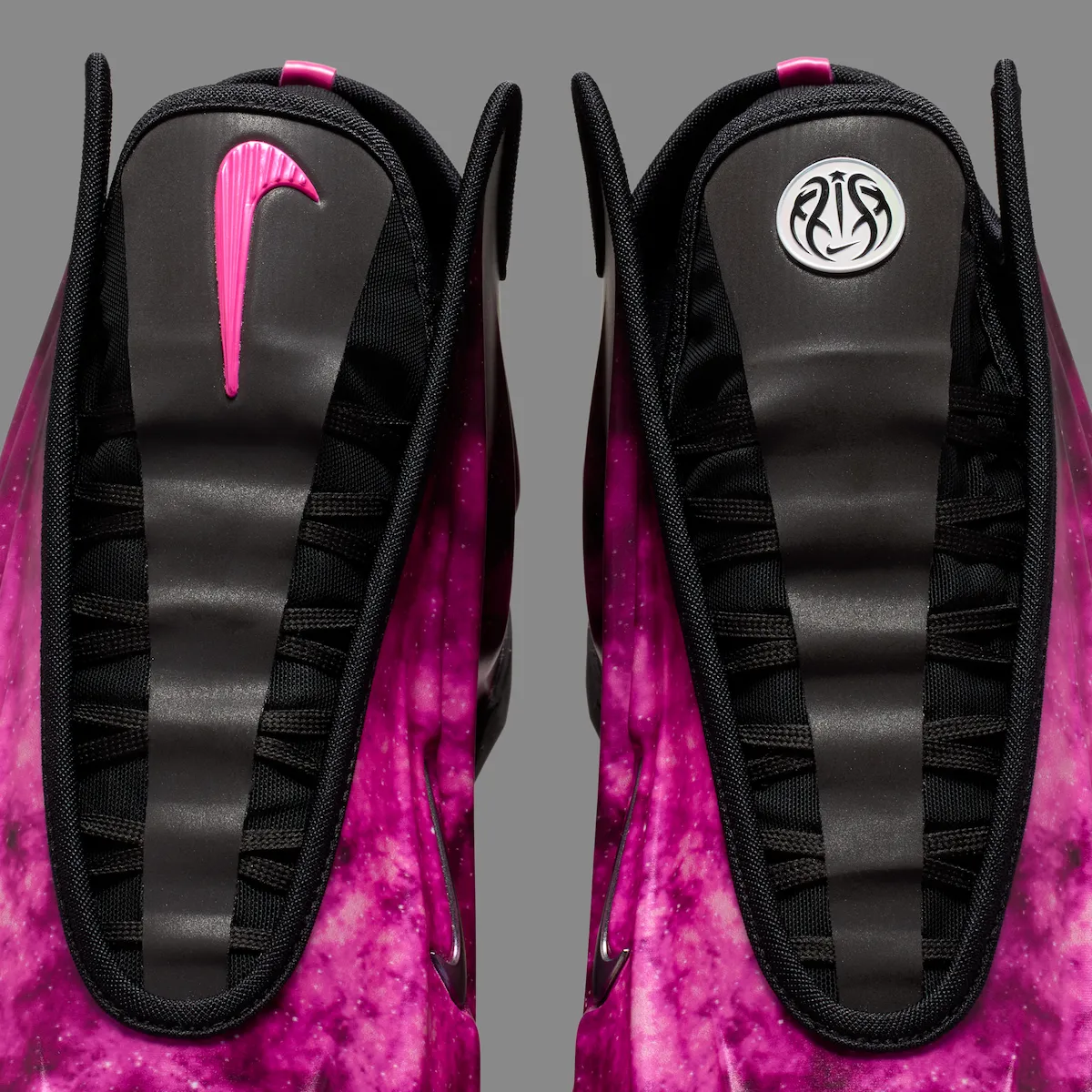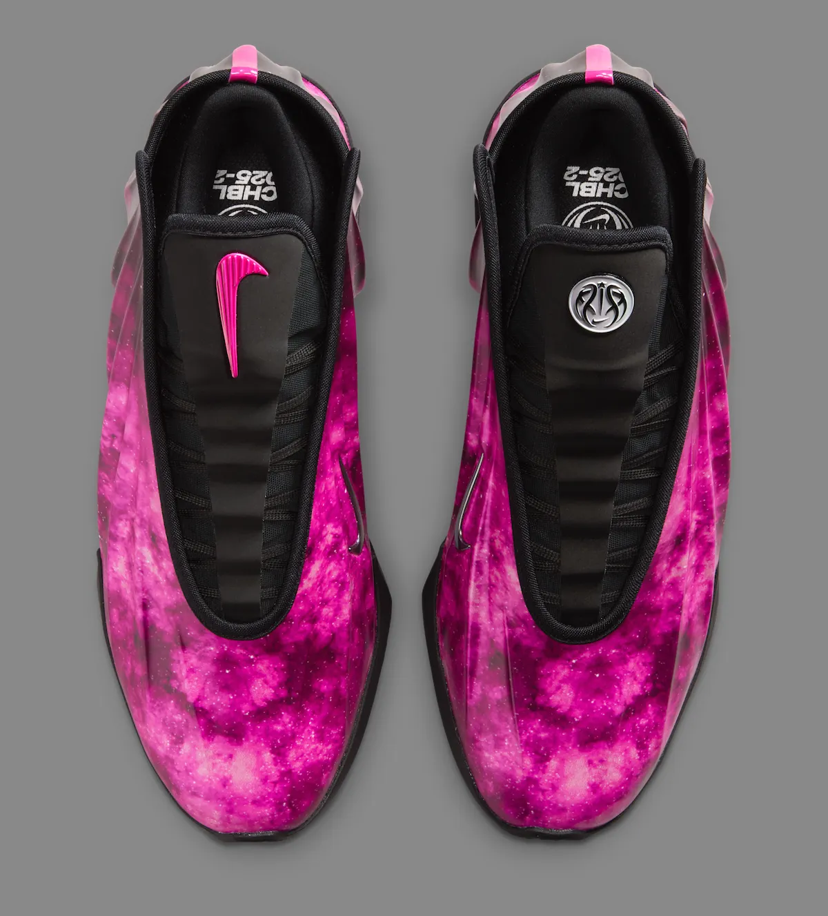 Black contrast on the tongue, lining, and outsole gives the sneaker a sharper balance while letting the galaxy graphic stay front and center. Metallic grey Swooshes land on the sides, and the tongue branding adds another unique detail with a pink Nike Swoosh on one shoe and a silver CHBL basketball logo on the other.