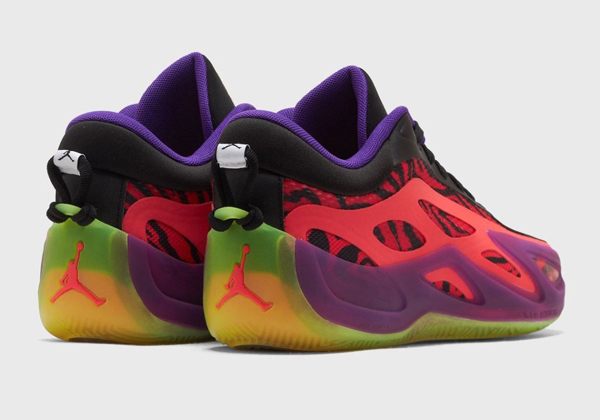 Loaded with loud colors, this shoe amplifies the Jordan Heir Series. Led by red tiger stripe accents, lime green, purple and metallic gold sprinkles add more zest to the upper. The overall finish is one that feels expressive and notable for a shoe tied to family, celebration and Paolo’s journey to the league.