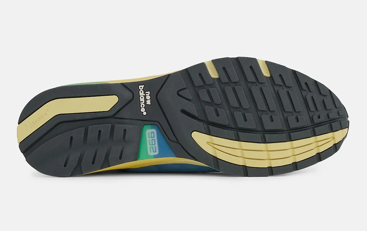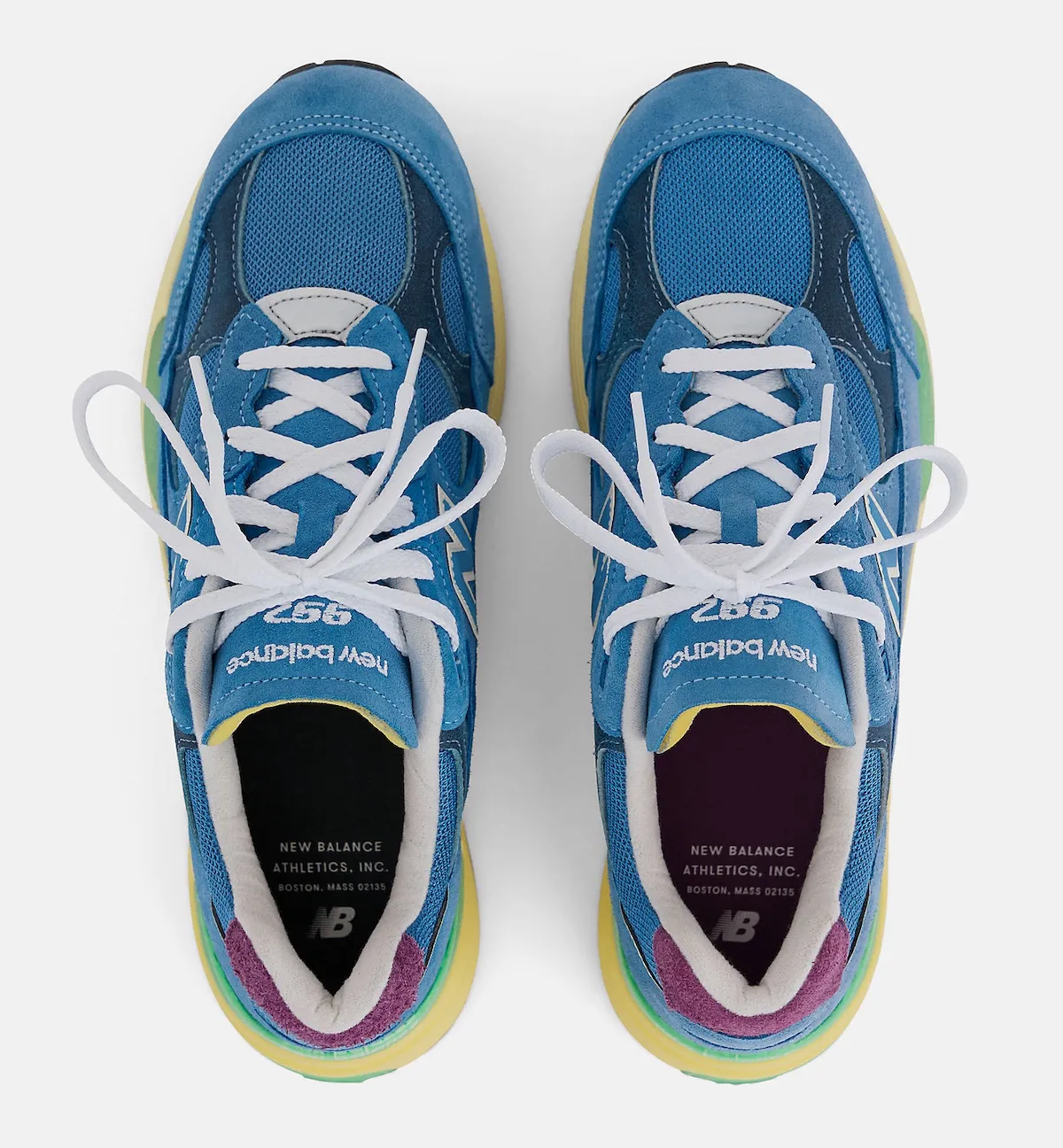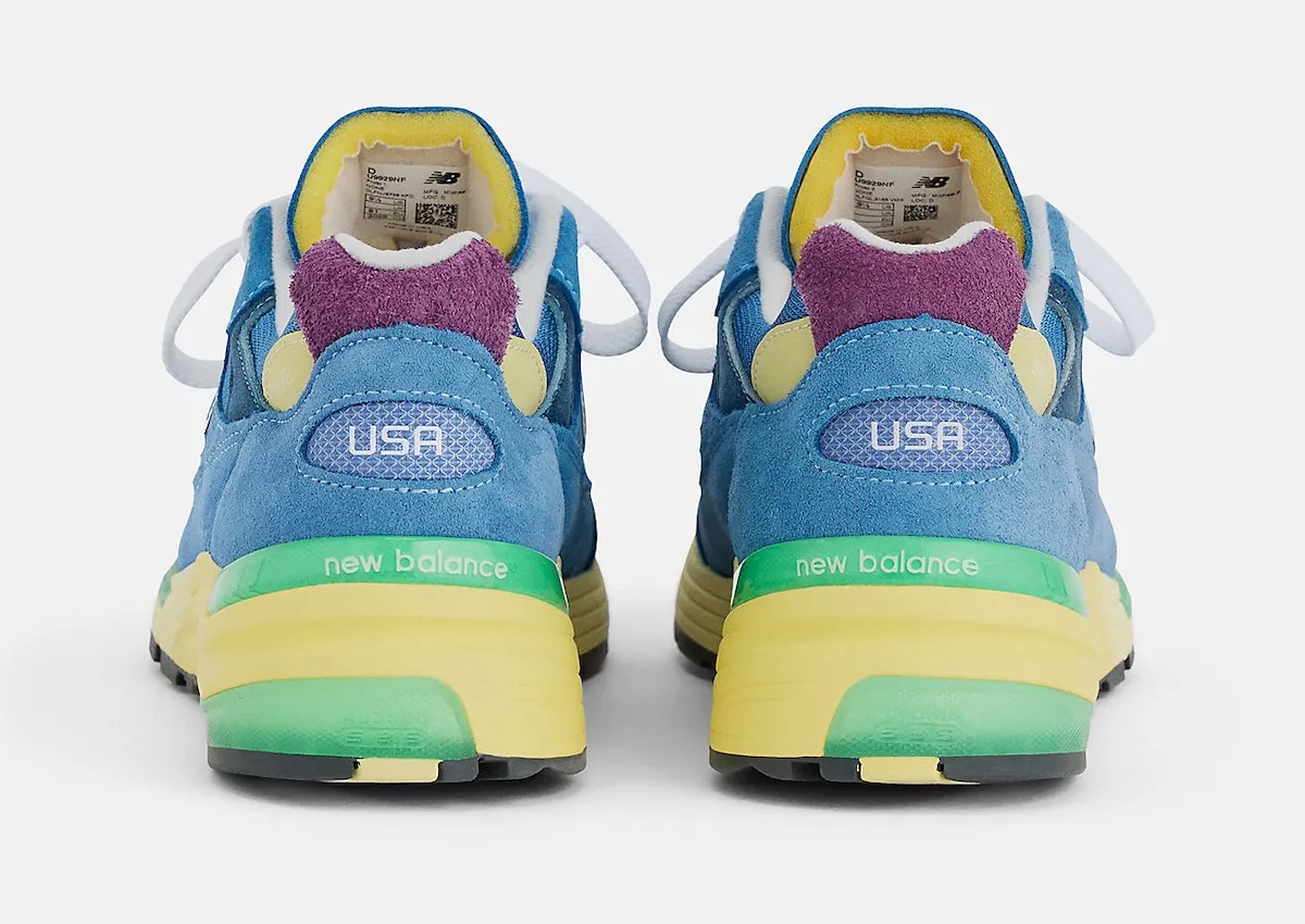 Blue suede overlays take over most of the upper, while darker blue panels and matching mesh underlays bring added depth through the midfoot and toe. A pale yellow midsole shifts the look even further, and green cushioning details around the sole give the pair a sharper pop. Purple suede at the heel finishes the color story with another unexpected touch, giving the 992 a spring-ready makeup that feels bold without losing the model’s classic shape.