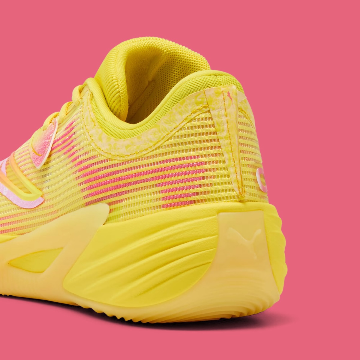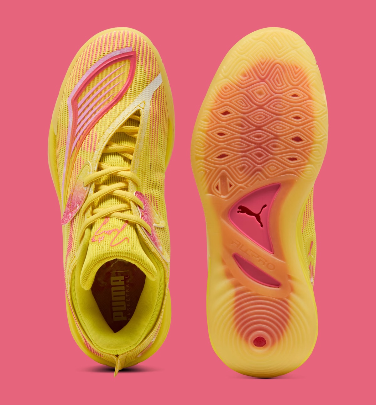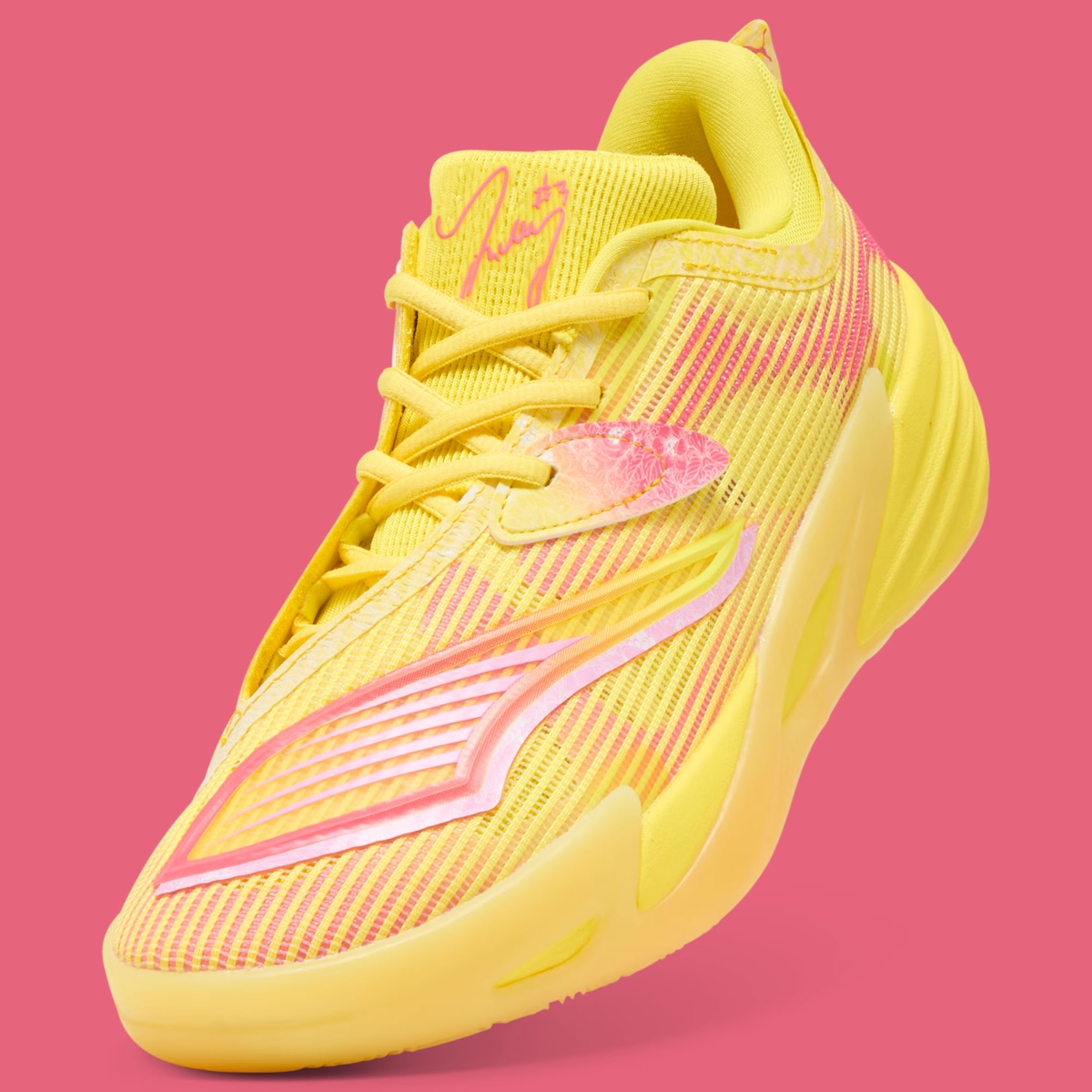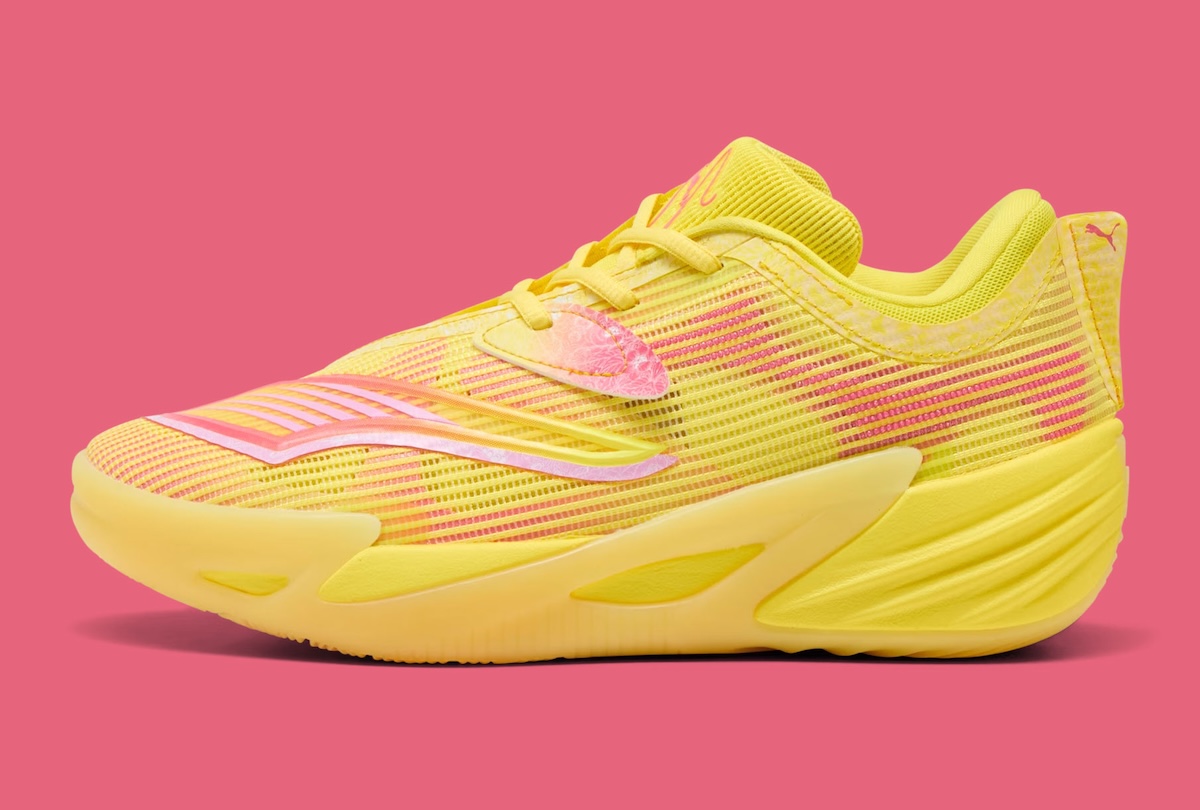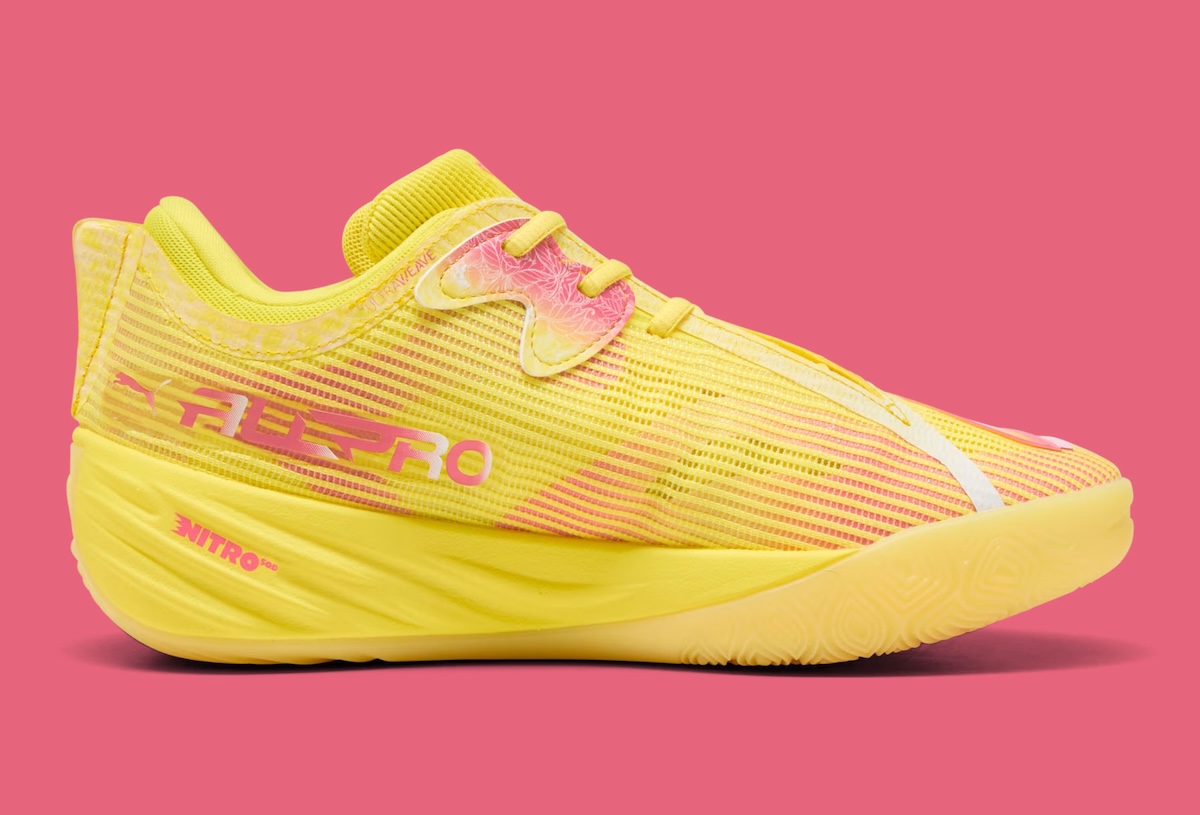 The PUMA All-Pro NITRO 2 “Josh Giddey” PE starts with a vivid yellow base and mixes in pink gradient details for a clear pink lemonade-inspired finish. Yellow mesh covers the upper, while pink accents show up across the side panels, tongue branding, and lace protection areas. White floral graphics on the lace tabs give the shoe a softer contrast, and Giddey’s pink signature on the tongue adds the personal touch that ties the PE together.