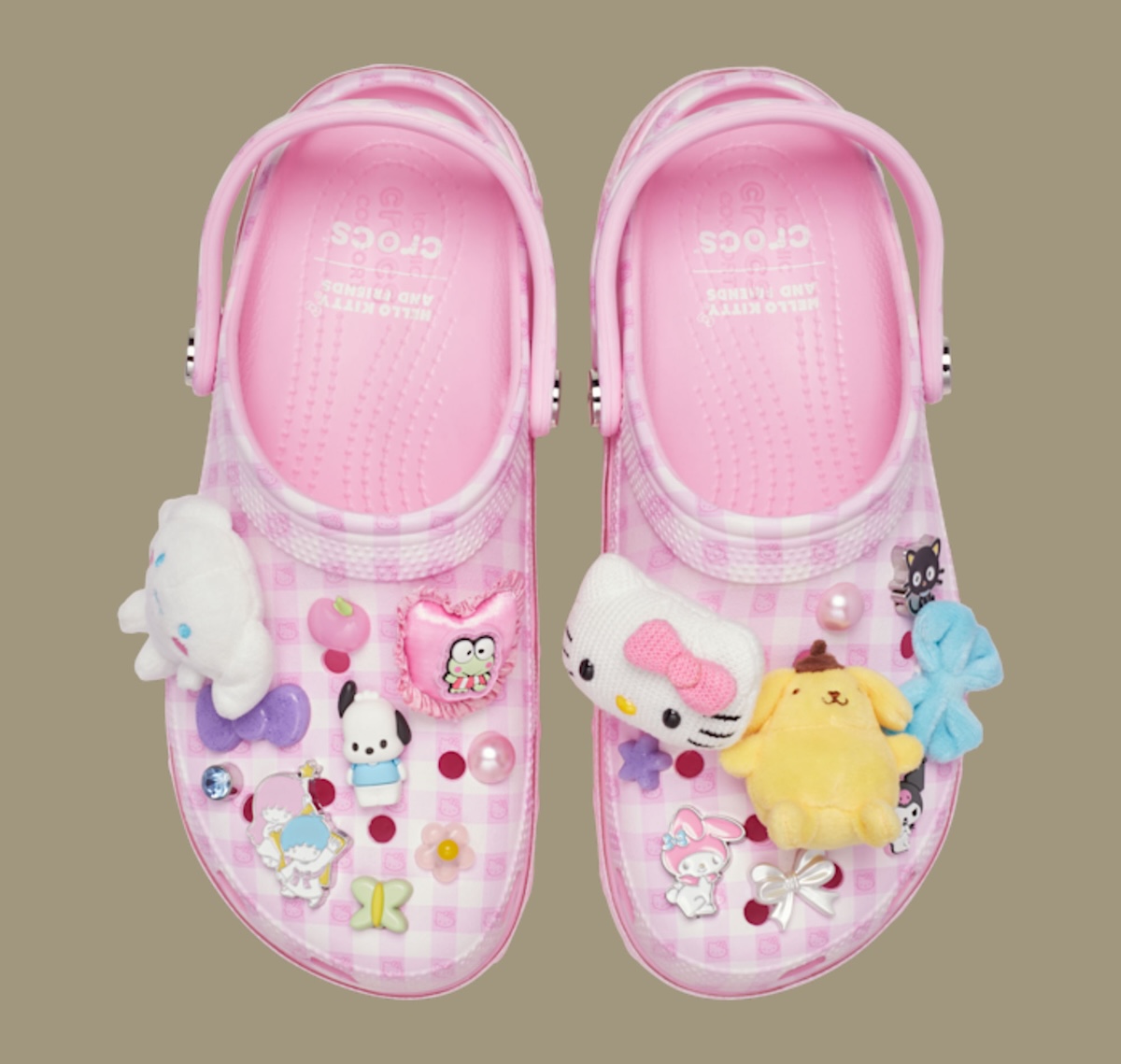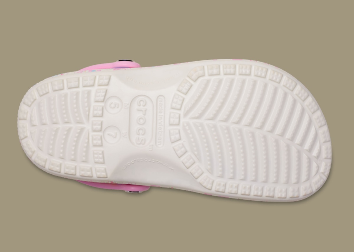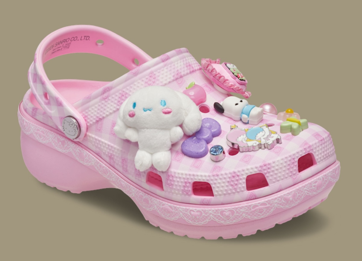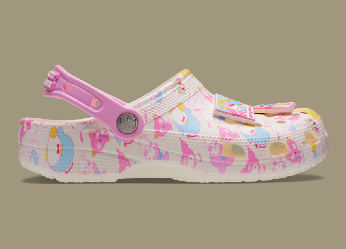 The Crocs Platform Clog offers the softer side of the release. A pink checkered base sets the tone, while lace-style detailing runs along the sidewalls. This pair keeps the printed graphics lighter and lets the charms carry more personality. Hello Kitty even returns sporting a crochet accessory.