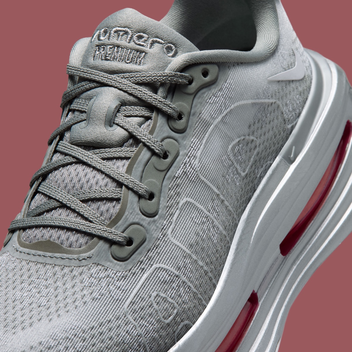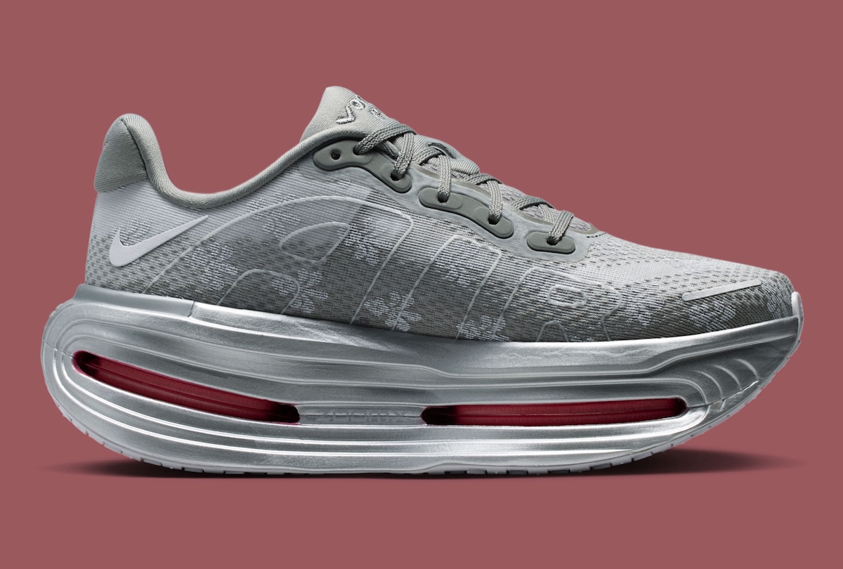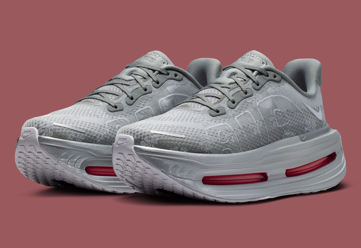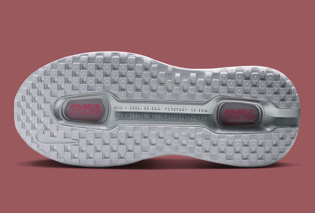 Metallic Silver carries most of the midsole, giving the chunky cushioning setup a more futuristic feel. Peony red fills the long Air Zoom windows along the sidewalls, creating the strongest contrast on the shoe. The same red tone returns on the insoles, outsole pods, and small heel Swoosh embroidery.
