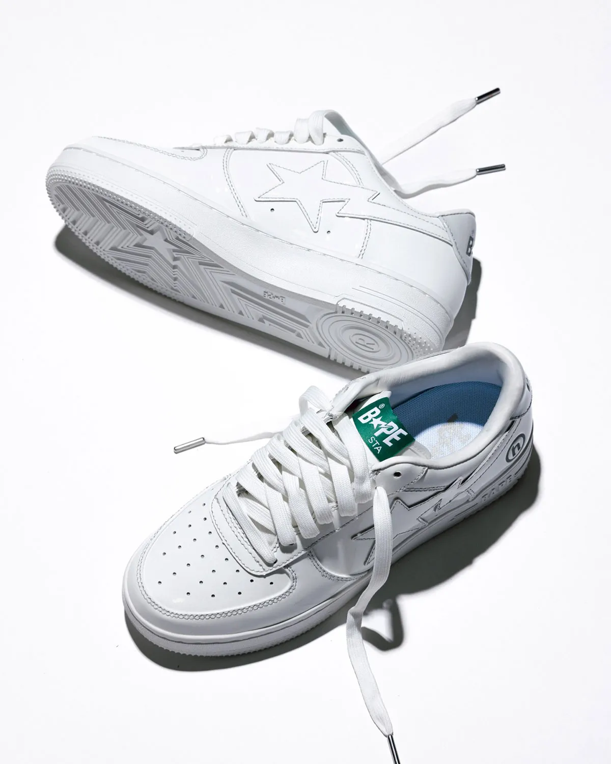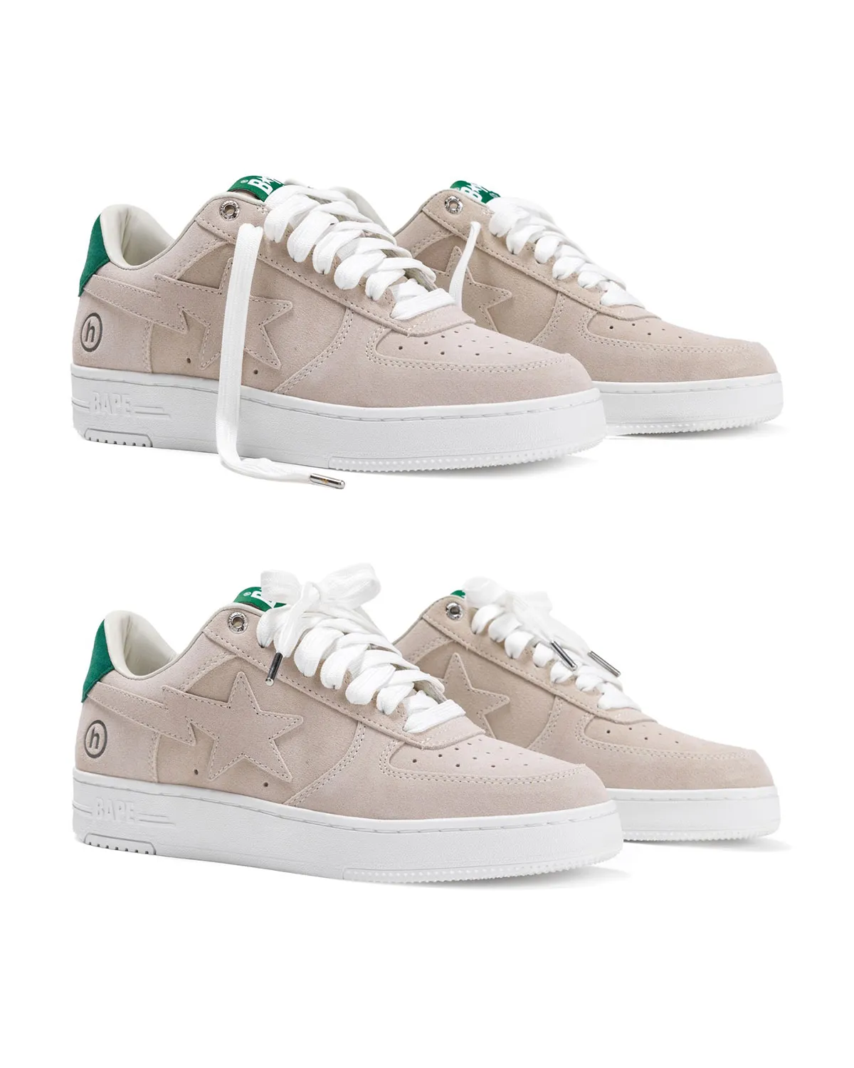 Hidden’s circular “h” logo appears on the lateral heel, adding a subtle stamp to both sneakers. The white pair leans more minimal, while the suede version adds a softer lifestyle feel with its neutral base and green accents. Both pairs sit on white midsoles with BAPE branding along the side.