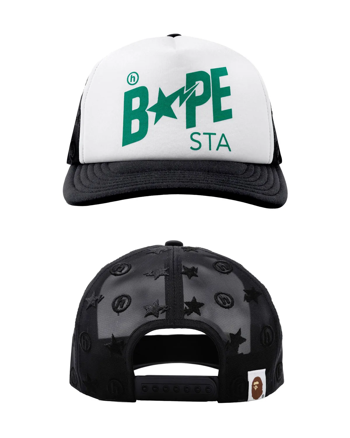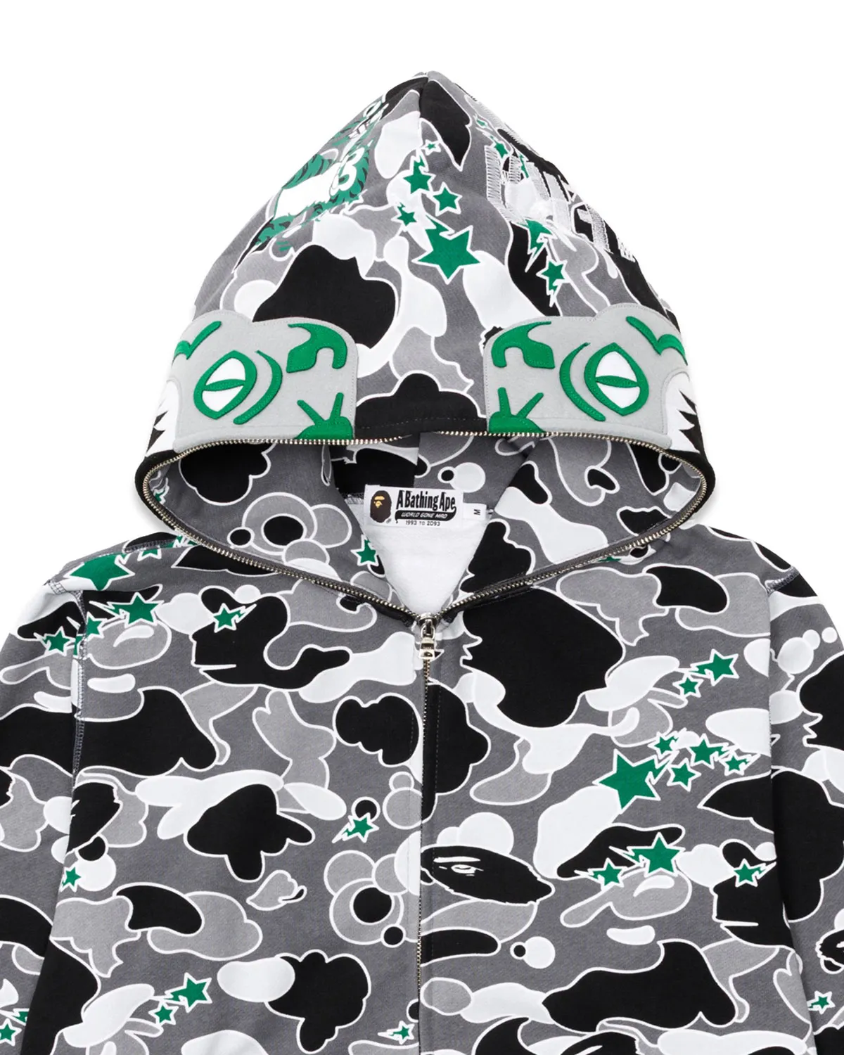 The capsule also includes a full range of apparel and accessories. A grey camo zip hoodie and matching sweatpants feature green star hits, while black and white tees use oversized green ape graphics. The release is finished with a co-branded trucker hat and a green gorilla-shaped ashtray.