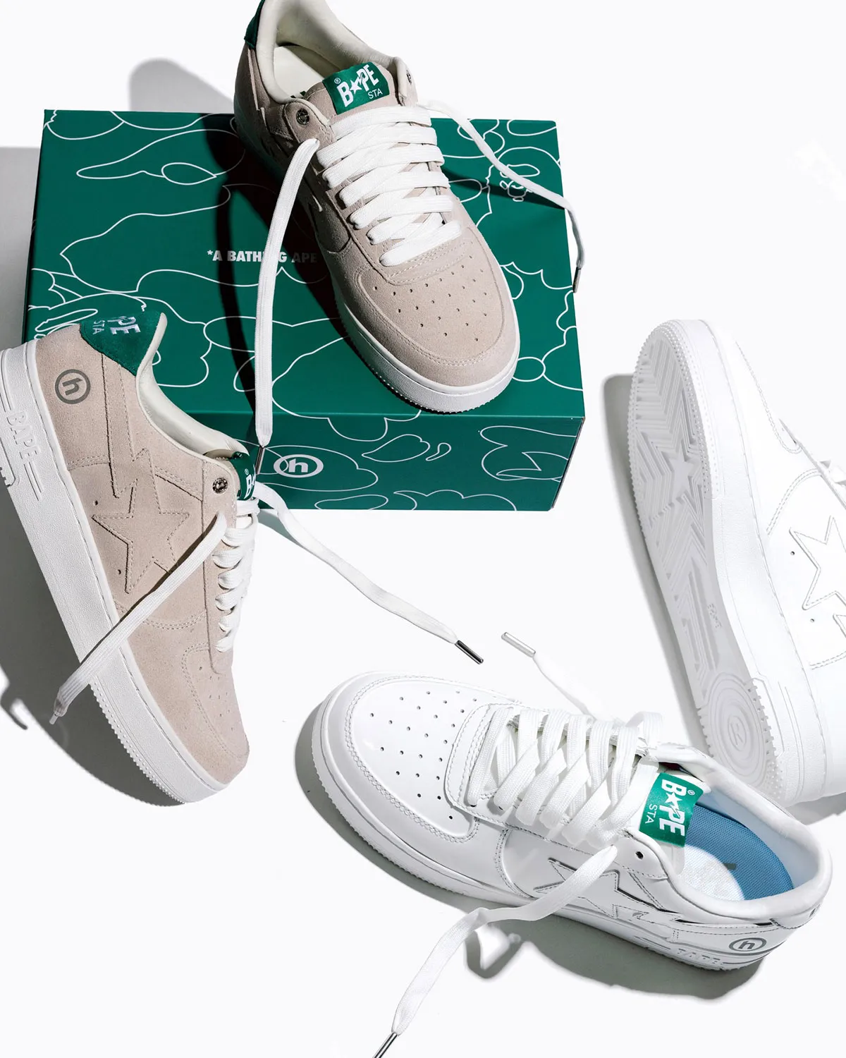The Hidden NY x Bape Sta leads the collection in two different styles. One pair keeps things classic with an all-white leather upper, tonal star logos, white laces, and green Hidden branding on the tongue. The second pair uses a beige suede upper with white laces, green heel tabs, and the same co-branded tongue detail.