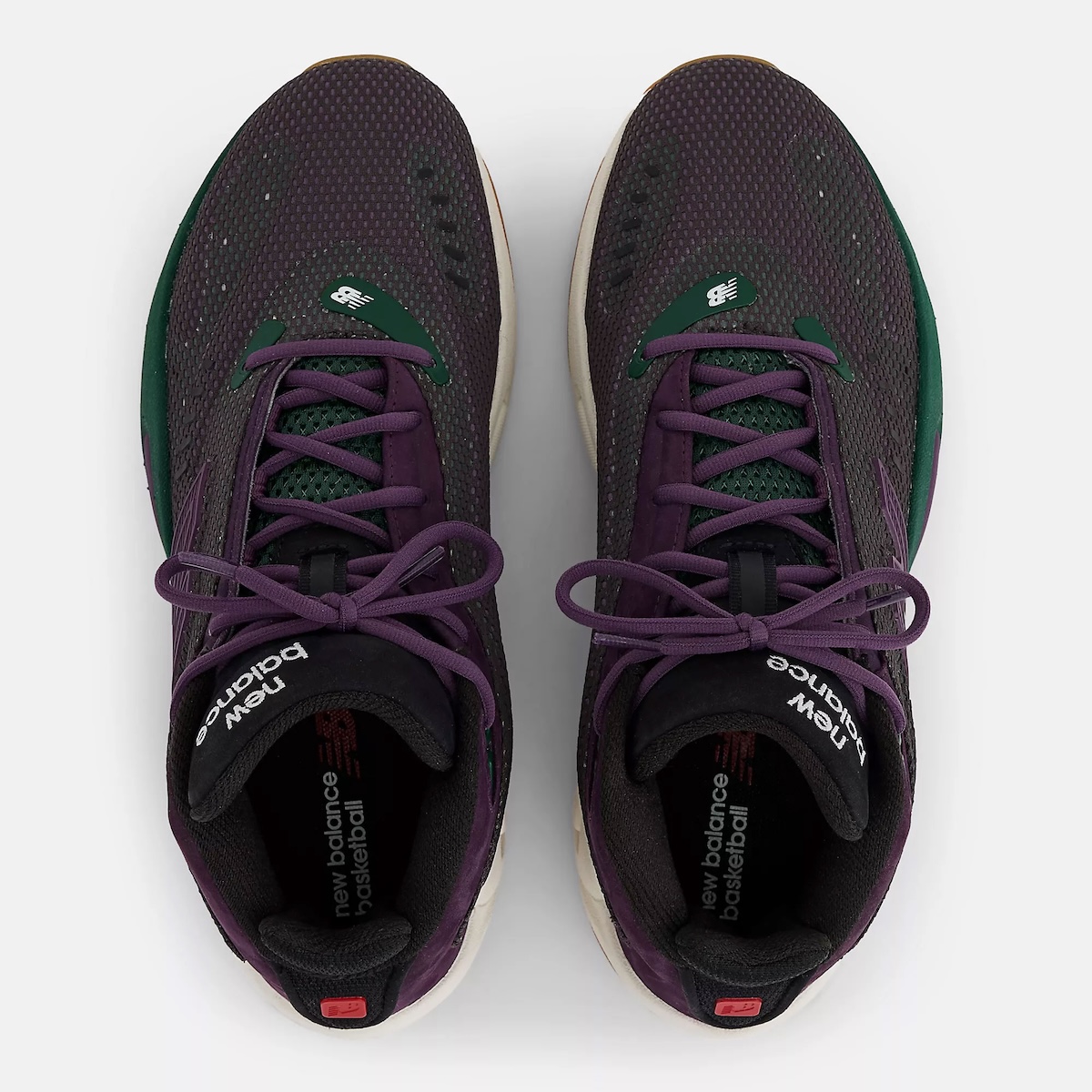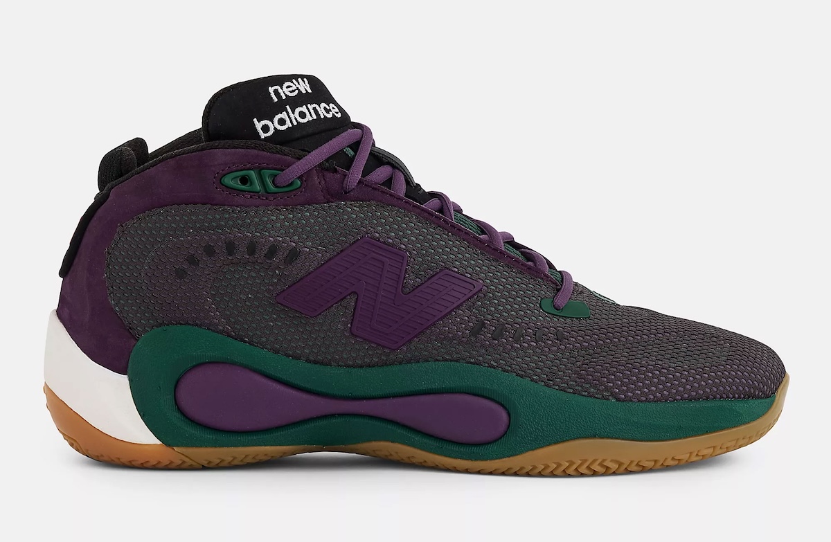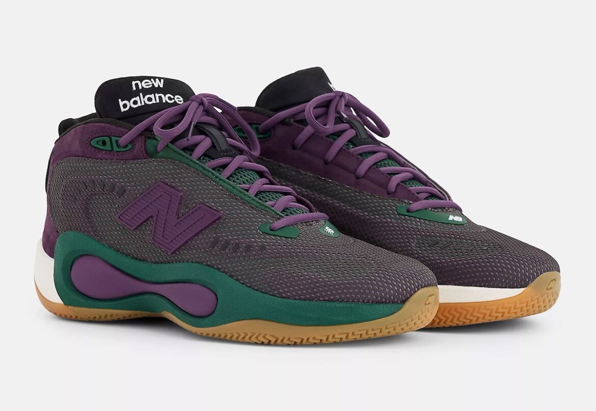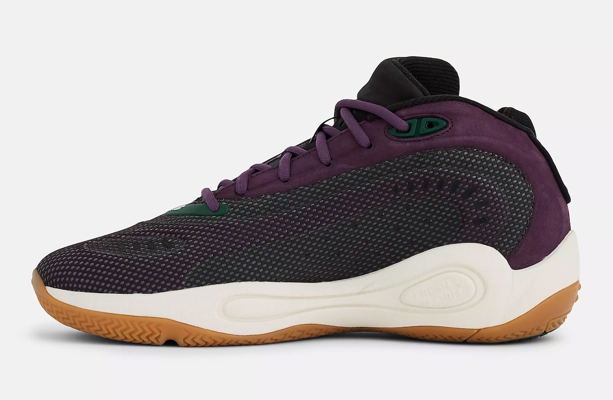 Purple laces help pull the upper together, while black padding on the tongue adds another dark layer. A cream sculpted midsole cuts through the deeper tones and gives the shoe some needed contrast. The gum rubber outsole finishes the design with wavy and herringbone-style traction built for quick cuts on indoor courts.
