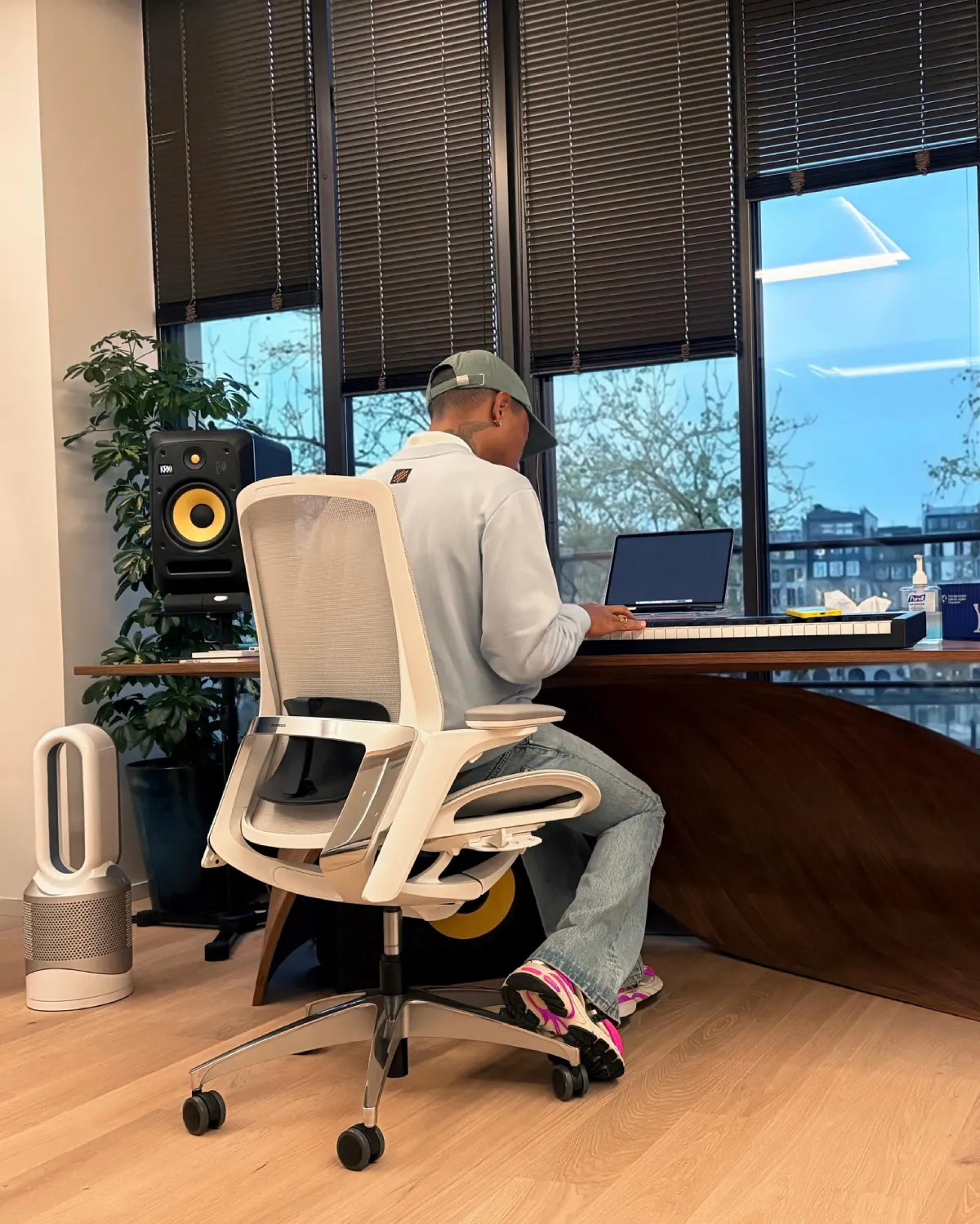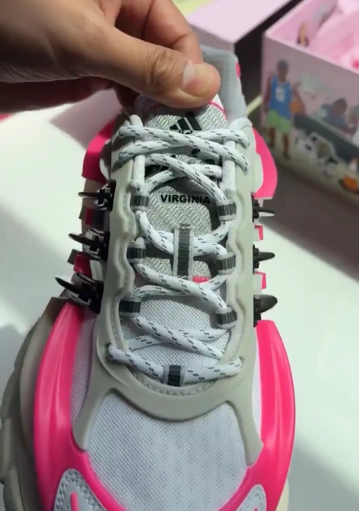 “Virginia” branding lands on the tongue as a personal nod to Pharrell’s roots. Thick rope laces, sculpted 3D panels, and a black rubber outsole complete the futuristic runner-inspired build.