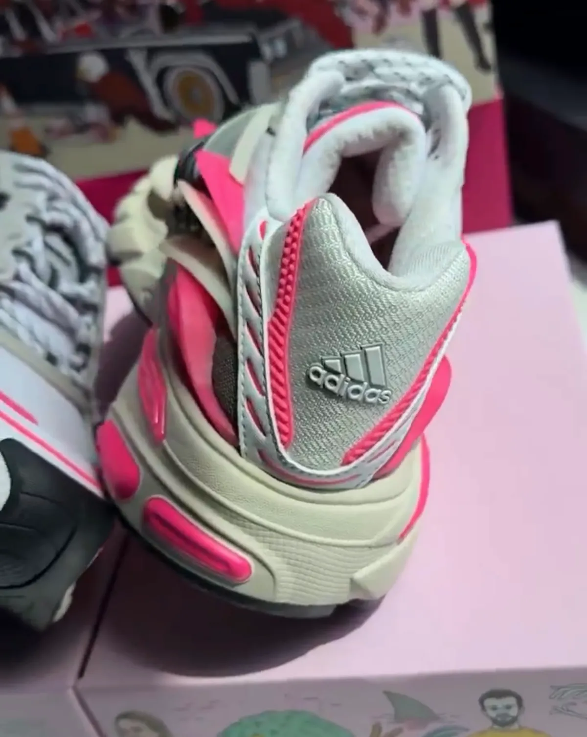 Pink detailing appears across the raised side overlays, heel panels, toe trim, tongue, and midsole accents. Black Three Stripes add contrast through the center of the shoe, while cream overlays and a matching cream midsole help balance the louder color pops.