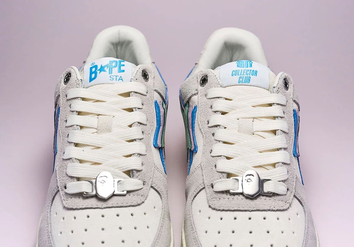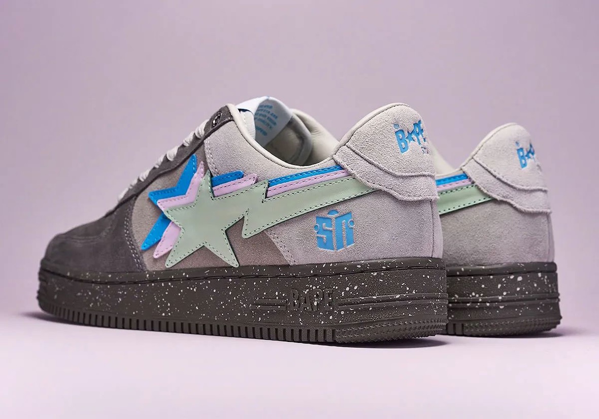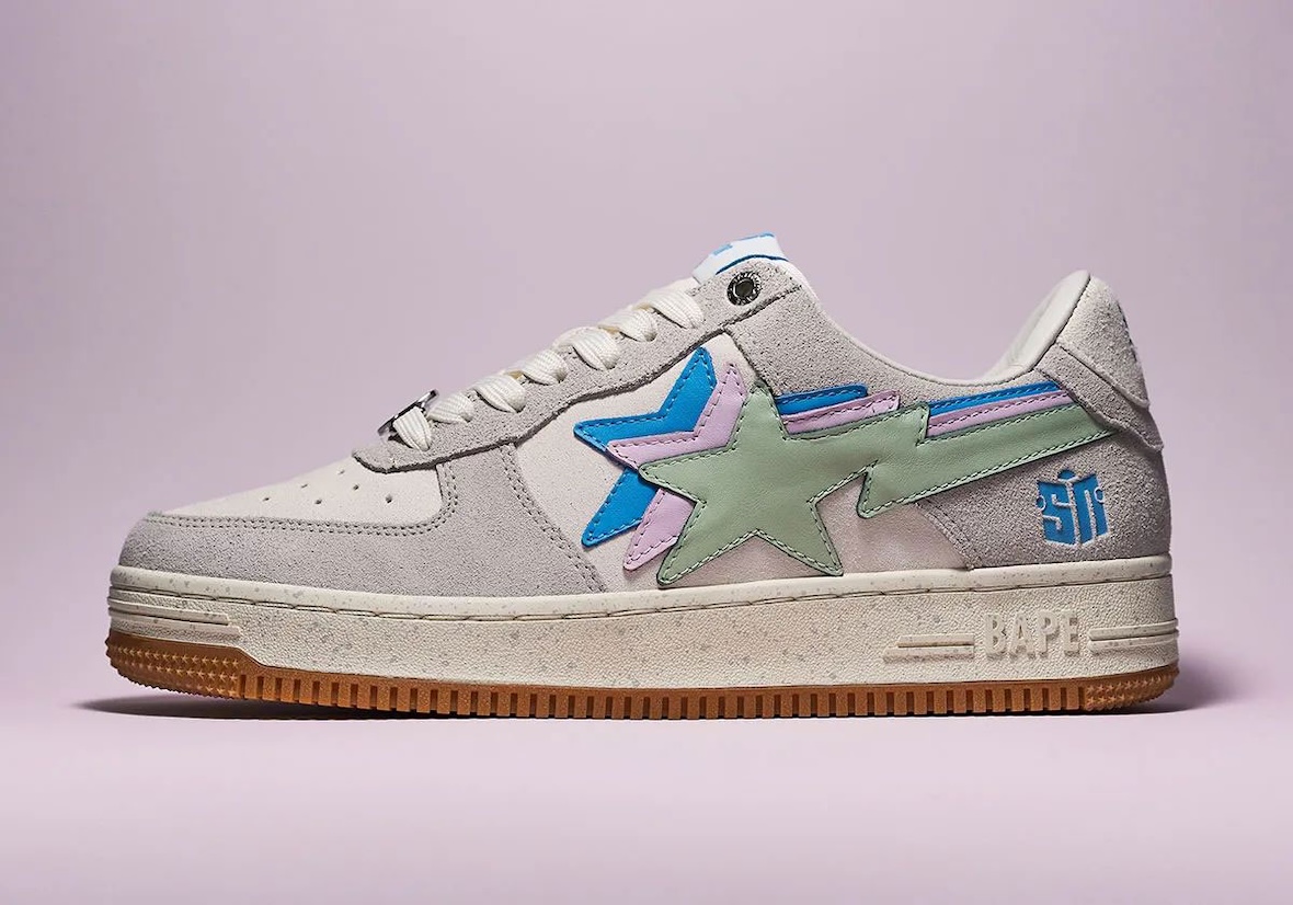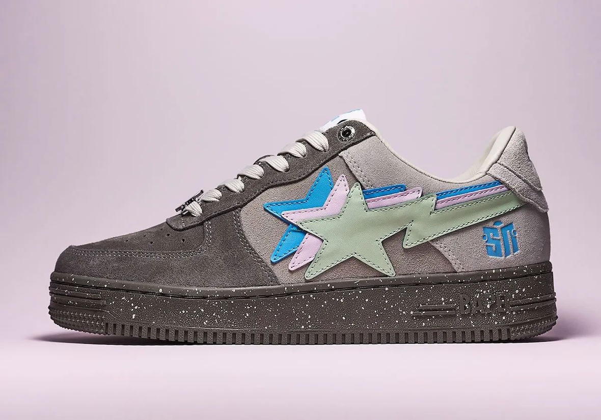 The Sneaker News BAPE STA “Day” and “Night” pairs take opposite approaches while sharing the same new triple-stacked STA logo, a first for the BAPE STA. The “Day” edition uses an off-white base with grey suede overlays, pastel hits of mint, lavender, and sky blue, and a gum outsole for a clean streetwear feel. The “Night” colorway shifts darker with charcoal grey gradient suede, a speckled outsole, and the same pastel accents, which stand out more against the moodier upper.